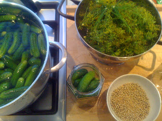 Hege hadde skyllt agurkene innen jeg kom med Ella som skulle hjelpe til å legge agurkene i glass, så det var bare å sette i gang. Ella klippte dill blomster og vi begynnte å legge agurkene lagvis med dill og krydder i glass mens Hege kokte opp lake og hellte den over så snart glassene var ferdige. Vi tok med oss våre glass hjem med instruks om å helle ut laken dagen etter, koke den opp og helle den tilbake i glassene. Med erfaringen fra i fjor i minne, tok jeg en smakebit før jeg la glassene ned i kjelleren – mmmmmmm, det var agurker det…….