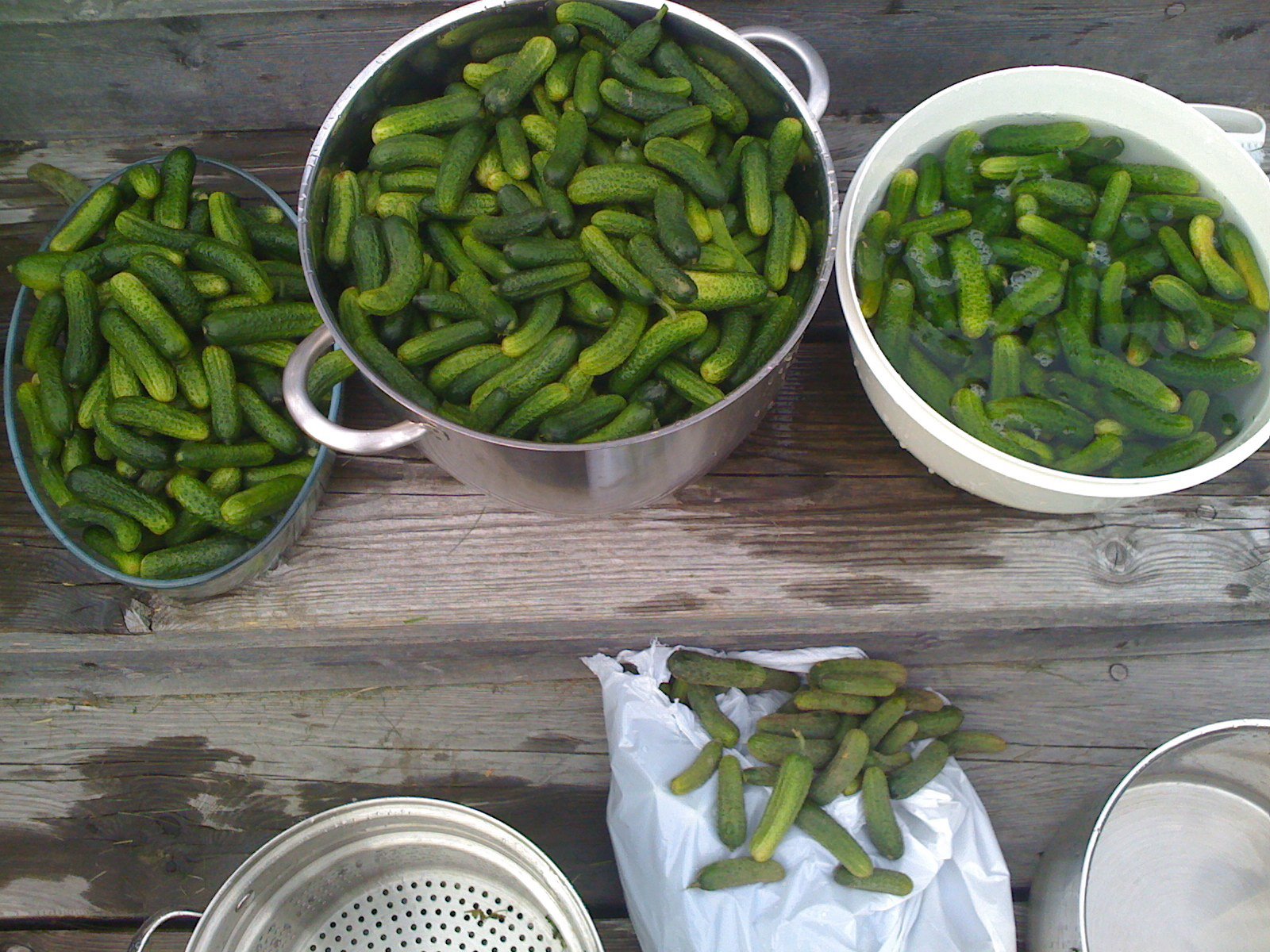 Jeg forsøkte meg på agurker i fjor, men med et noe blandet resultat. Etter oppskriften skulle agurkene legges i salt lake og skylles, noe som skulle repeteres over 3 dager. Så skulle det kokes en ny lake som skulles helles over med tilsetning av div. krydder, for så å settes til side i en mørk kjeller en 6 ukers tid før de skulle spises. Skuffelsen var stor når dagen kom og agurken skulle smakes – altfor salte var de….. Nå skal jeg ikke gi oppskriften hele skylden, men sånn er det med nye oppskrifter…..det funker ofte ikke.
