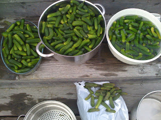 I år fulgte jeg oppskriften til Hege, eller rettere sagt Hege´s svigermor. Svigermoren til Hege er visst ganske rå på å sylte og har innvidd Hege i godt utprøvde oppskrifter. Jeg har smakt agurkene tidligere, en blanding av surt, salt og søtt, akkurat som jeg liker de. Jeg holdt på å gå glipp av hele sesongen, men fikk bestillt 10 kilo deilige irr grønne agurker som var blitt plukket dagen før. Etter en rask telefon til Hege, bar det rett avsteds til henne hvor vi da tilbrakte et par timer på trappen og vasket og børstet agurkene rene for jord. Agurkene ble lagt i en salt lake natten over og vi avtalte å treffes igjen dagen etter for å gjøre agurkene ferdige…