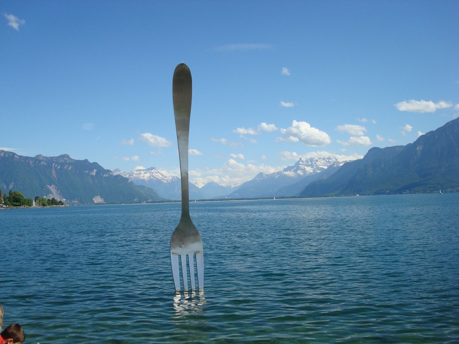 Gaffelen er montert i Lac Leman utenfor Vevey i Sveits.Her har Nestlé sitt hovekvarter og det setter sitt preg på byen. I tillegg til å finne «Palais Nestlé» finner du også en mat museum på sjøens breddekant, hvor du selvfølgelig også finner en egen Nestlé avdeling. Gaffelen i sjøen utenfor museet var visst montert som en temporær utstilling i forbindelse med et ti års jubileum, til glede for mange, også disse «gærne» sveitserene som har forsøkt å klatre den…