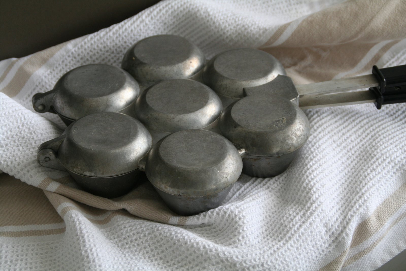 Da er det igjen tid for loppemarkeder og denne gangen styrte jeg unna alle norges glass etter å ha sett hvor mange jeg fortsatt har i kjelleren….. Men en munkejern har jeg ikke, og denne ble behørig plukket opp og kjøpt av meg – kr 25 for munkejern og to brødformer gjør at jeg ikke trenger å ha dårlig samvittighet for ikke å bruke munkejernet så altfor ofte….. Jeg skal forsøke å bruke den i sommer, tenkte jeg, kanskje som et alternativ til vaffler – er det noen som har en god oppskrift?