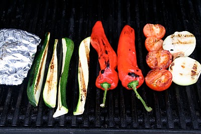 Vask grønsakene.Skjær tomater og løk i to. Skjær squash på langs. Pakk to hvitløksfedd (uskrellet) i litt aluminiums papir. Pensle grønnsakene med litt olivenolje og legg de på grillen sammen med hvitløkspakken. Grill grønnsaker på middelsvarme til de begynner å bli myke – ca. 10 minutter. Legg de i en tildekket skål etterhvert som de blir ferdige. Hent frem food processoren din. Du kan med fordel skjære grønnsakene i noe mindre biter før du legger de i maskinen. Huden fra paprikaen bør fjernes, frø og stilk også. Press hvitløksfeddene melllom fingrene for å få den myke hvitløksmassen ut.