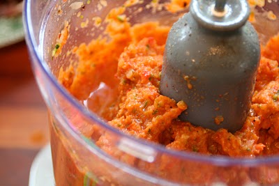 Ha alt opp i food processoren og sett i gang. Husk også å få med deg alle grønnsaks saftene som har samlet seg i bunnen av skålen. Smak til med salt og pepper, noen chilli flak (du kunne også ha lagt en chilli på grillen for den saks skyld) og urter fra hagen.