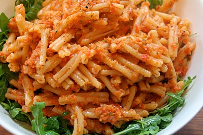 Restemiddag var dette. Og nå sitter jeg og spiser kalde rester av restemiddagen – ikke verst! Jeg var noe uinspirert for å lage middag – ja, det skjer – bladde litt i kokebøkene mine og kom over en kyllingrett med saus laget av grillede paprika og hvitløk. Det hadde jeg liggende. Men jeg hadde også en halv squash (den andre halvdelen hadde jeg brukt på pizzaen – kan anbefales) og noen veldig modne tomater som burde spises snarest. Jeg fisket også frem en pose ruccola, løk, urter fra hagen og pasta. Så husket jeg på at jeg hadde ny food processor og – wee hee, nå ble det plutselig gøy å lage middag en mandags kveld…