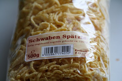 Jeg kjøpte Spätzle i min lokale innvandrerbutikk. Har også sett de i spesialitetsbutikker og større matbutikker. Spätzla kan også fint ersattes med pasta – tagliatelle for eksempel er veldig godt til.