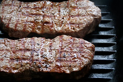 Varm opp en stekepanne (gjerne med riller – eller bruk grillen) for kjøttet. Når den er rykende varm legger du på kjøttet. La de ligge urørt på stekepannen ca. 4 minutter før du snur den. La den igjen ligge i ro en 4 minutters tid. Snu den igjen, men drei kjøttet litt slik at får fin rille mønster. Stek i 2-3 minutter, snu og la det steke en 2-3 minutter til. Test kjøttet med fingeren – kjøttet bør være medium stekt nå. Sett kjøttet over på en tallerken, dekk med folie og la det hvile.