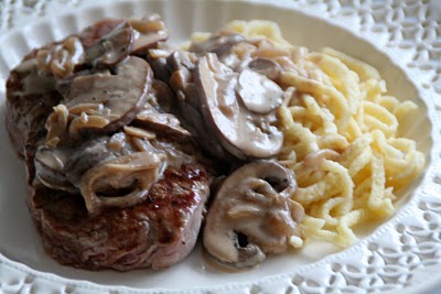 Jeg elsker biff stroganoff. Når jeg kunne velge bursdags middag valgte jeg biff stroganoff. Når jeg kunne velge hva som skulle serveres ved min konfirmasjon, valgte jeg biff stroganoff (som da gjærte i garasjen og måtte lages om på nytt et par timer før servering….) Når vi var ute og spiste middag, valgte jeg biff stroganoff. Og ja, jeg ha laget mye biff stroganoff i mange forskjellige varianter. Dette er en ny variant, som passer bedre til årstiden synes jeg. Jeg har grillet hel stykker av kjøtt og laget stroganoff saus ved siden av. Og servert med spätzle. Spätzle er en sveitsisk/østerisk variant av pasta. Skal du lage selv lager du en litt løs deig av egg, mel og vann presser så deigen gjennom en rivjern, direkte i kokende vann. Resultatet blir en noe knoklede pasta som er litt mindre tung en italiensk pasta. Men du kan også kjøpe den som tørrvare:
