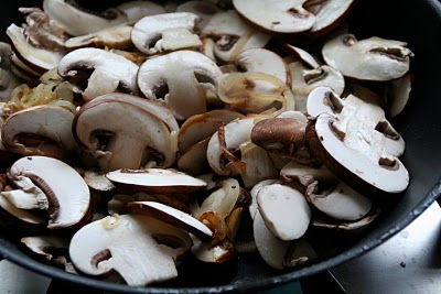 Ha alt klart. Skjær grønnsaker, mål væske, tørk kjøttet og ha litt olje, salt og pepper på og sett over en kjele med vann til spätzle. Begynn så med sausen. Ha litt olivenolje i en stekepanne og stek løk og hvitløk sammen på middels/høy varme – la de gjerne bli litt brune. Krydre med litt salt og pepper. Ha opp i sjampinjong og stek videre. Rør inn i mellom og la det steke til sjampinjong vesken er fordampet. Hell på konjakk og la det koke til fordampet. Hell kraft/buljong og la det koke en 4 minutters tid.