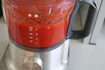 Ha tomater og hvitløksfedd i en food processor og kjør til du har en nogenlunde glatt blanding.
