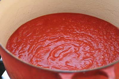 Hell tomatsausen i en gryte.