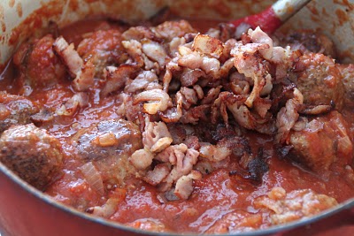 Ha kjøttbollene i tomatsausen etter hvert som de blir ferdige ( de trenger ikke være gjennomstekt da de koker videre i sausen). Etter du har stekt alle kjøttbollen, hell litt vann (eller gjerne vin) i stekepannen for å få med alle godbitene som har samlet seg der. Hell opp i tomatsausen. Ha bacon opp i også og rør alt forsiktig sammen. Smak til med salt og pepper. Sett på lokk og la det putre en 15 minutters tid. I mellomtiden kan du rydde opp, dekke bord og koke spaghetti. Bruk gjerne fullkorn spaghetti, gjerne fra Barilla eller en annen god italiensk produsent. Server med nyrevet parmesan ost og litt nykvernet pepper. Skal du spise spaghetti som en italiener er det kun lov å bruke gaffel… Buon appetito!