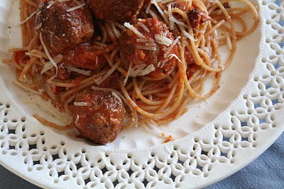 Kjøttkaker, men ikke i brun saus og ikke servert med poteter. Dette er spaghetti and meatballs. Og selv uten italiensk mama så har dette fulgt meg gjennom min barndom, ungdom og voksen alder for så å bli introdusert til neste generasjon. Og gjett om de liker det! Som med alt annet finnes det mange variasjoner av denne amerikanske/italienske retten. Ikke minst i størrelsen på kjøttkaken – de kan bli enorme. Her har jeg basert meg på en oppskrift jeg fant i Bon Appetit, men har sløyfet litt og tilsatt litt som seg hør og bør. Jeg har laget en stor nok porsjon slik at du får middag til 4, to ganger. Frys porsjon nr. 2, så kan du ta det frem den dagen du ikke rekker å lage middag..
