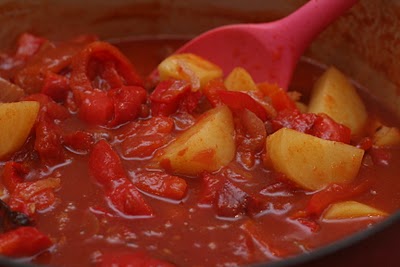 Ha opp i poteter, hakkede tomater, kraft og paprika og la det hele småkoke til potetene er møre. Hell suppen i en blender og hell tilbake i en ren gryte. Dette må du gjøre i flere omganger. Suppen skal være ganske tykk. Synes du den er for tykk kan du vanne den litt ut. Smak til med salt og pepper. Hell over i skåler og pynt med rømme og vårrløk. Server gjerne litt brød til.