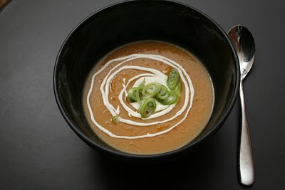 Hell suppen i skåler, ha en skje rømme opp i suppen hvis du ønsker og pynt med vårløk. Server med brød.