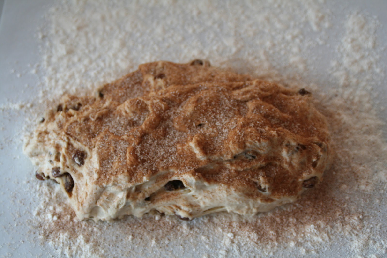 Den vil da omtrent se slik ut. Bland sukker og kanel sammen i en liten skål. Hell deigen over på kjøkkenbenken som du har dekket med et stykke bakepapir godt strødd med mel.