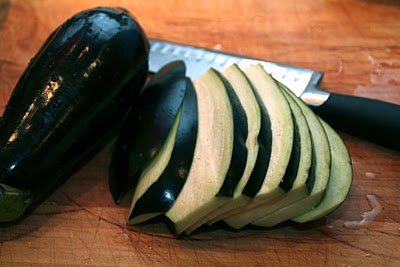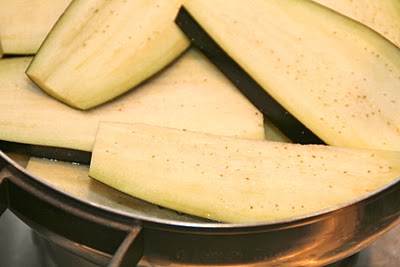 Skyll aubergin skivene rikelig med vann og tørk med tørkepapir. Pensle aubergin skivene med litt oliven olje. Varm en stekepanne eller grillpanne og stek auberginskivene i omgang til de har fått litt farge og er myke. Legg de på tørkepapir så snart de er ferdige. Krydre de med litt salt og pepper under stekingen.