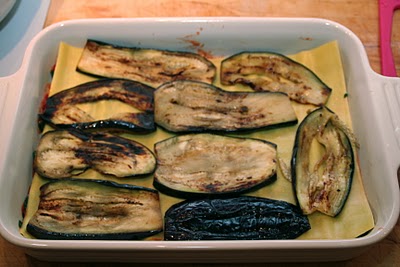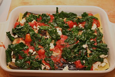 Ha noen ss tomatsaus i bunnen av formen din (min form målte 24x32cm). Strø litt spinat over og legg på et lag med lasgneplater. Fordel noen aubergin skiver på toppen av dette.