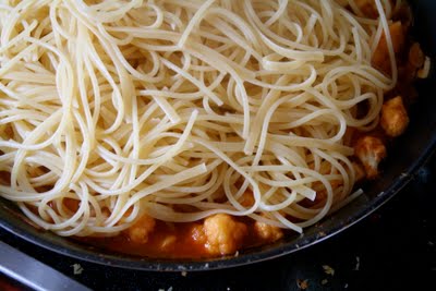 Vannet til pastaen bør koke nå. Tilsett salt og pastaen og kok etter pakkens anvisninger (7-8 minutter). Dette gir deg tid til å rydde litt og dekke bordet :). Når pastaen er al dente (dvs den har fortsatt litt bit) heller du den i en kolander. La det dryppe litt av (ikke skyll i vann). Sausen din bør nå også være ferdig, og kokt inn noe. Bland spaghettien med sausen.