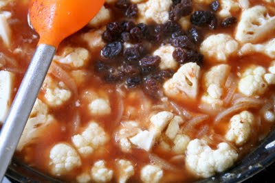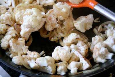 Ha noen ss olivenolje i stekepannen. Stek løken på middelshøy varme til de er myke – ca. 3 minutter. Tilsett hvitløken,blomkålen og kanelen og stek videre i noen minutter.