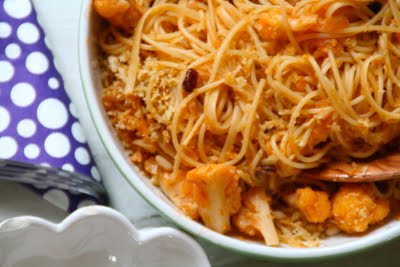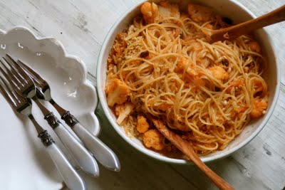 En fin og nyplukket blomkål fristet på gårdsutsalget forleden og etter en rask titt på google – stikkord pasta & blomkål – fant jeg frem til dette forslaget. En enkel pastarett med milde smaker (passer til barn). Hele middagen lages på 20 minutter – og ønsker du en ren vegetar variant ertsatter du kyllingkraft med grønnsakskraft.