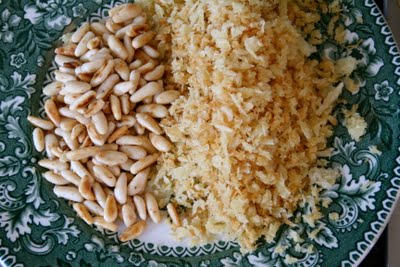 Ha noen ss olivenolje i en stekepanne. Stek brødsmulene til de er gyldenbrune. Ha de over på en tallerken. Tørk stekepannen med et papirhåndkle og stek pinjekjernene gyldne. Legg de på en tallerken.