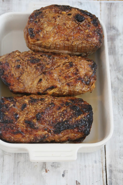 Skinke lå i lake et døgn før den ble kokt for så å bli stekt med en glasur bestående av sennep og krydder.
