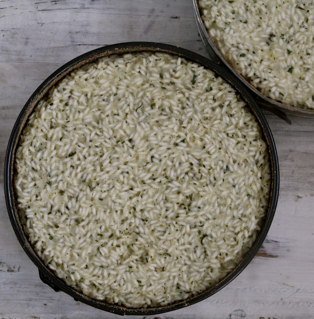 Når det så nærmer seg dagen før festen, ja da er det bare å sette alt annet til side og sette i gang. Risotto ble laget, lagt i former og avkjølt i påvente av oppvarming like før festen.