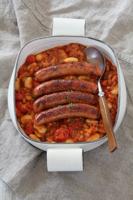 Under kategorien lettvinte middager rangerer denne ganske høyt. 30 minutter tar det deg fra start til servering, det er virkelig ingen kunstverk. Gode pølser er nå lett å få tak i i de store kjedebutikkene – om du velger bratwurst eller annen type pølse er opp til deg – mye godt å velge mellom nå. Og bønner, ja, der gjelder det samme. Jeg har brukt store hvite bønner og borlotti bønner – men her kan du bruke hvilke type bønner du ønsker. Jeg foretrekker milde bønner, ja, og skal jeg være ærlig så synes jeg også lyse bønner gjorde seg best i den røde sausen. Må være interiørarkitekten i meg 🙂
