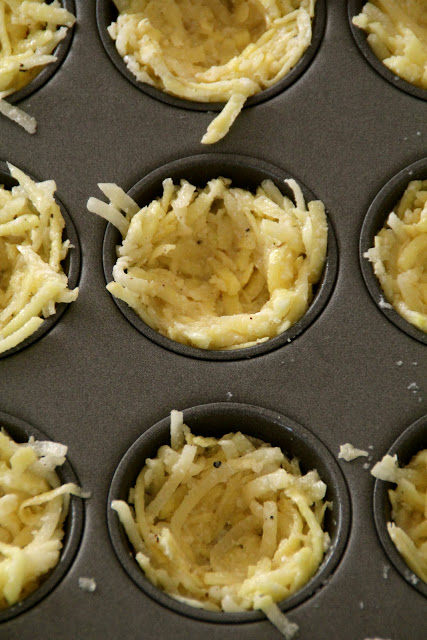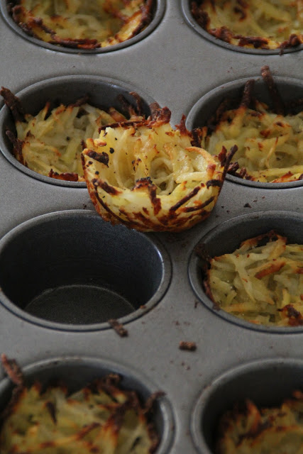 FANTASTISK ide! Jeg har nå mine første 12 i ovnen. Blir sikkert 36 tilsammen. Men jeg har lagd min egen vri. I tillegg til poteter og ost, raspet jeg gulerøtter, purreløk, vanlig løk og paprika + en dash med koriander i tillegg til salt og pepper.