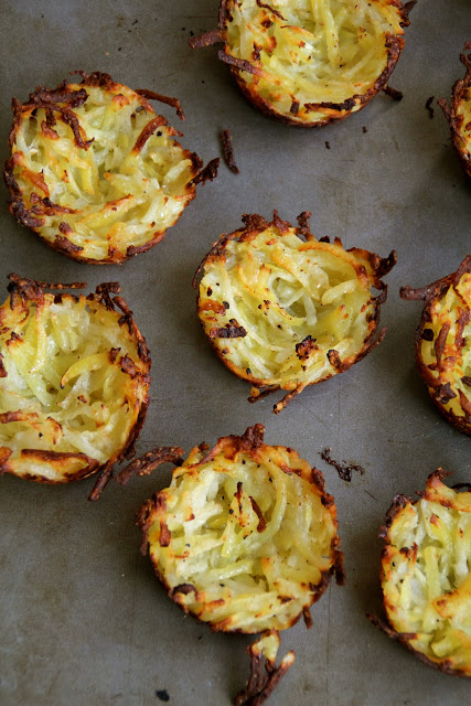 Jeg fikk umiddelbart lyst til å prøve meg på min egen variant på parmesan hash browns som jeg har kalt potetreder. For det er nettopp det de er. De kan selvsagt spises som de er, men de kan også fylles. Med rømme for eksempel. Eller med rømme og laks for eksempel. Eller kanskje rømme og rogn…. Og så kunne man lage de i mini-muffinsformer slik at de var akkurat store nok til å putte i munnen som en liten appetitvekker. Å jeg kjenner at ideene ruller på her….