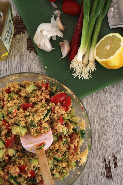 Lag salaten. Lag couscous (gjerne med kyllngkraft) ved å følge pakkens anvisninger. Fjern frø fra agurkene og skjær i terninger. Skjær tomatene i 2 eller 4 båter alt ettersom hvor store de er. Skiv vårløkene og finhakk chilli’en om du bruker den. Bland alt sammen med couscousen.